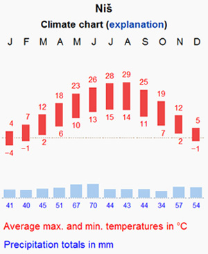 The climate of the Niš area is moderate continental, with an average yearly temperature of 11.2 °C. July is the warmest month of the year (with the average of 21.2 °C) and January is the coldest month (with the average of 0.2 °C). The average of the annual rainfall is 567.25 mm, while the average barometer value is 992.74 mb. There are 123 days with rain and 43 days with snow. On the average, the wind force is just below 3 Beaufort. May is a month in spring with variable weather conditions that can result in sunny periods and occasional showers. Temperature will probably vary in the range from 10 to 25 degrees.